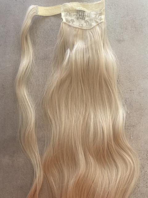 Enyhén hamvas szőke vasalható I. osztályú enyhén hullámos 60 cm szintetikus copf (13)